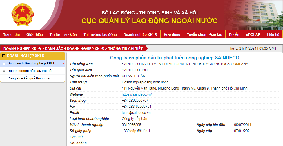 Công ty cổ phần đầu tư phát triển công nghiệp SAINDECO đã được Bộ Lao động - Thương binh và Xã hội cấp giấy phép hoạt động dịch vụ đưa người lao động Việt Nam đi làm việc ở nước ngoài theo hợp đồng.